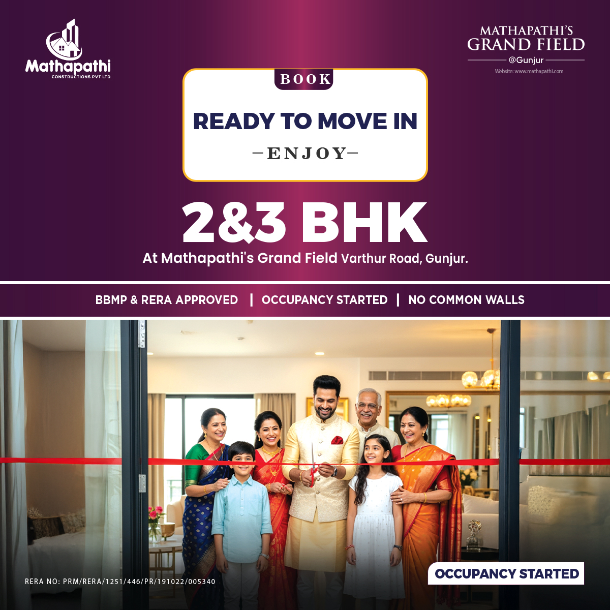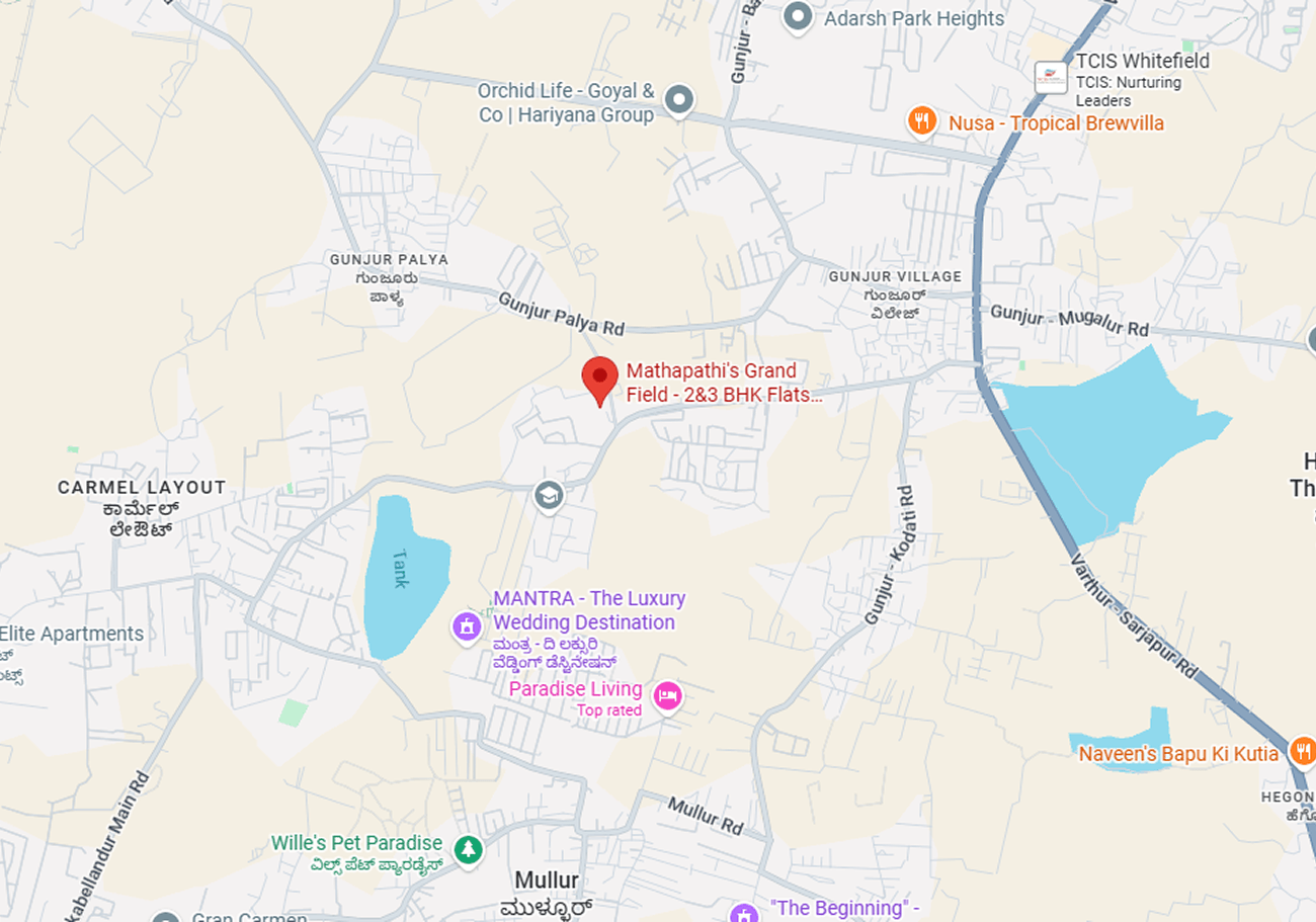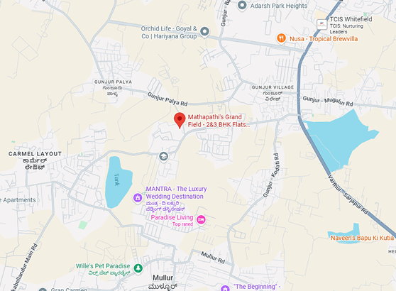 Mathapathi's Grand field, an emblematic masterpiece, proudly stands amidst the tranquil setting of Gunjur. Conveniently reachable via road, the project boasts an ideal location facilitating easy access to key areas of Bangalore such as Silk Board, Bellandur, HSR, Sarjapur Road, Marathahalli, and Varthur. Additionally, it enjoys proximity to significant IT hubs including Whitefield and Kadubeesanahalli. Located in Gunjur, Bangalore, the Mathapathi's Grand Field is a thoughtfully planned one, equipped with all amenities for a comfortable living. The property spreads over an area of 2 Acres. There are in total 126 units in this project. A professionally conceptualised residential property, this state-of-the art project is visually appealing. The residential property is ready to move in. The project offers an array of property choices such as flats to suit every individual's need.